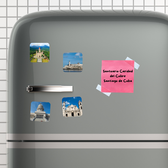 Basílica Santuario Nacional de Nuestra Señora de la Caridad del Cobre (Santiago de Cuba), construida en 1926, es el principal centro de peregrinación cubano y alberga la imagen de la Patrona de Cuba, una figura nacional venerada por los católicos y no católicos. Este iman es un recuerdo que late en el corazón de quienes nacieron allí o lo visitaron alguna vez,  símbolo de orgullo, identidad y nostalgia que convierte cada mirada en un viaje a las raíces y memorias más queridas.
