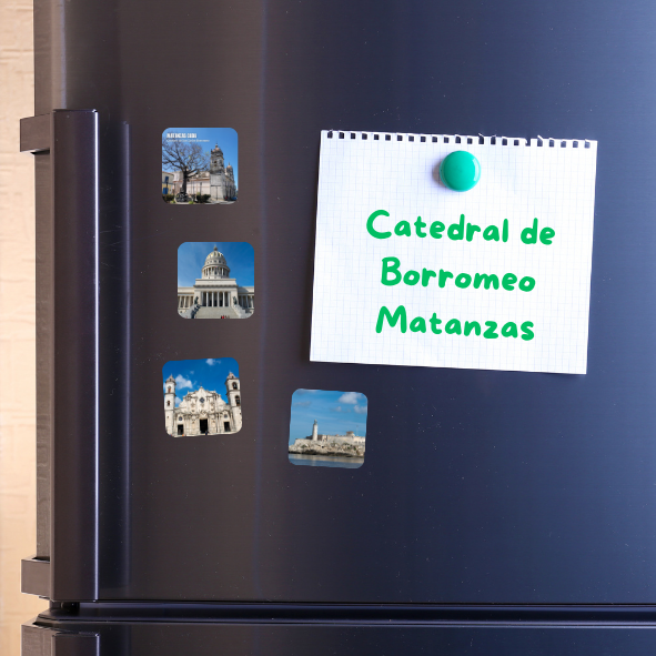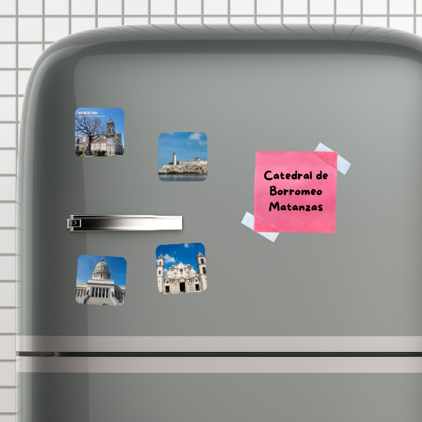 Catedral de San Carlos Borromeo (Matanzas), la primera piedra de la que hoy se conoce como Catedral de Matanzas fue situada el 12 de octubre de 1693. La bendición de la primera piedra de la iglesia fue el acto de fundación de la ciudad de Matanzas. Este iman es un recuerdo que late en el corazón de quienes nacieron allí o lo visitaron alguna vez,  símbolo de orgullo, identidad y nostalgia que convierte cada mirada en un viaje a las raíces y memorias más queridas.