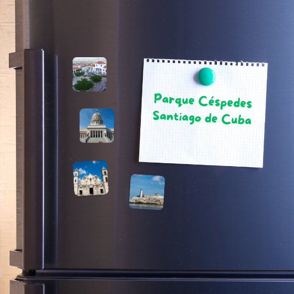 Parque Carlos M. de Céspedes (Santiago de Cuba), su fundación determinó la fundación de la ciudad en 1515. Constituye la plaza principal de la ciudad y por tanto el centro de mayor jerarquía. Este iman es un recuerdo que late en el corazón de quienes nacieron allí o lo visitaron alguna vez,  símbolo de orgullo, identidad y nostalgia que convierte cada mirada en un viaje a las raíces y memorias más queridas.